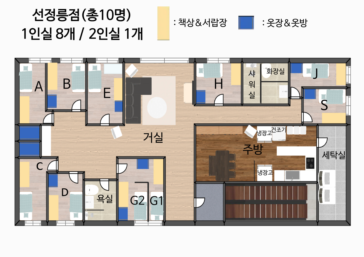 | 1인실이 8개, 분리형 2인실 1개로 구성되어 있는 선정릉점입니다. 선정릉역에서 도보 5분, 강남 생활권으로 접근성이 아주 좋은 곳에 위치해 있습니다. 주변에 치안센터가 있어 안전하고 마트, 스타벅스, 편의점이 가까워 생활하기 편리한 곳에 위치했습니다. 따로 또 같이의 정석! 독립공간을 보장해주고 넓은 공용공간을 이용하실 수 있어요. |